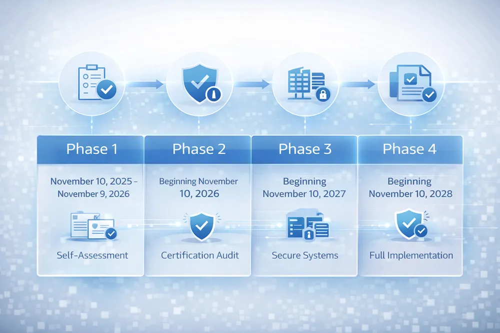 The formal Phase 2 deadline of November 10, 2026 understates how urgently the market is already moving. Major defense primes are enforcing CMMC compliance requirements on their supply chains independently of government contract language — and those requirements are binding on any organization that wants to maintain prime contractor relationships.